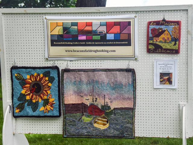 By Carolyn EllsAbout a dozen Guild members took part in Fête Nationale on the grounds of Centennial Hall as part of the City of Beaconsfield’s official celebrations. Our rug display and booth greeted people as they entered the artisan area. We enjoyed showing many people our rugs and talking about our craft. Several children tried hooking for the first time. Many of us noticed many wearable fibers among the animals in the petting area. It was a pleasant day to visit with each other and meet others in our community.